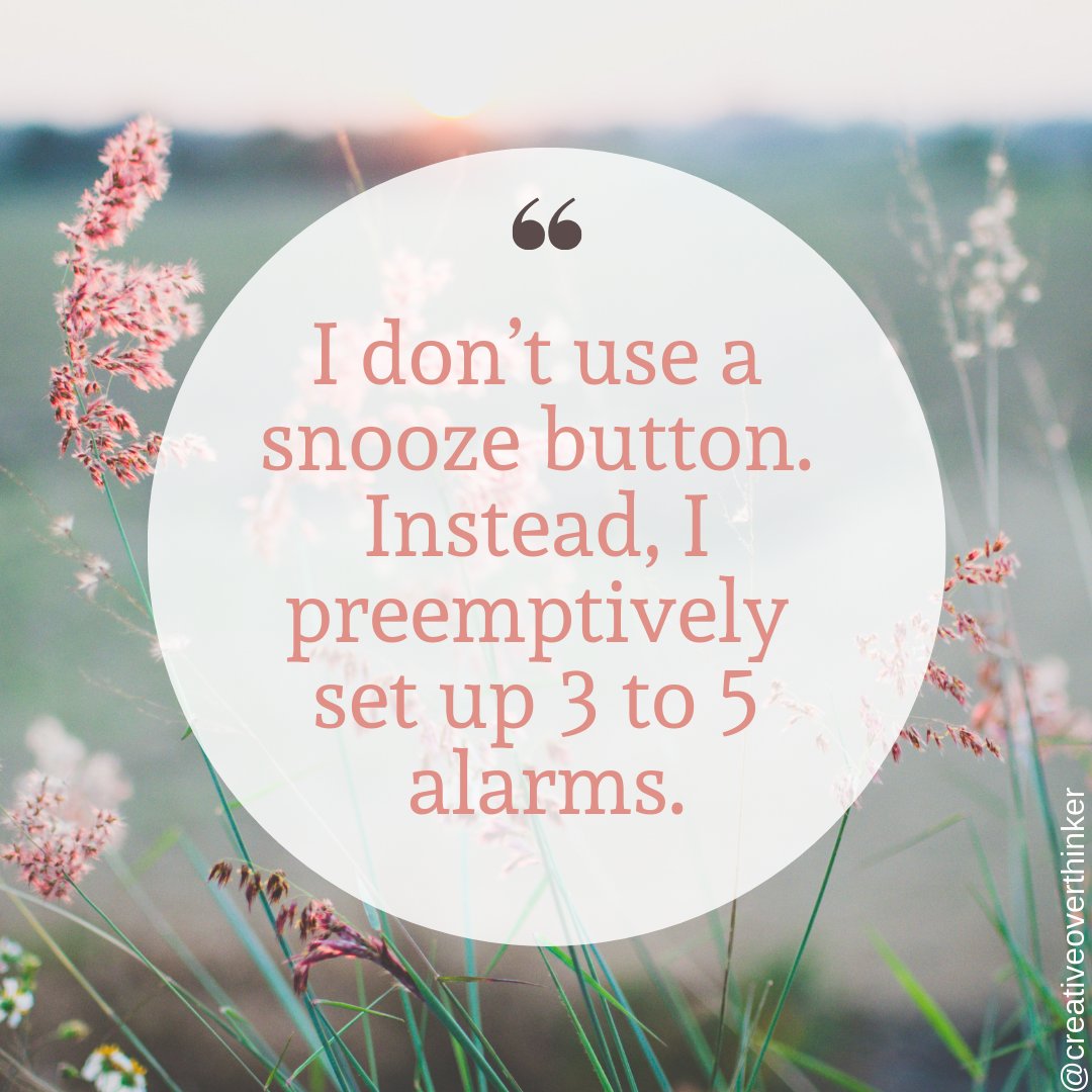 If the alarm is on, I refuse to accept its authority. Funny enough, I don’t use a snooze button. Instead, I preemptively set up 3 to 5 alarms that give me a range to have a nice, chill morning routine, or push me to brush my teeth and lace my shoes all at the same time. Most days I tend to do the latter.